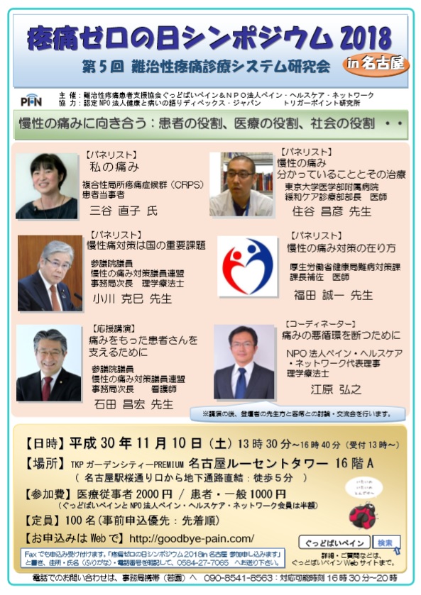 当財団と研修会・講演会等で協力関係にあります、NPO法人ペイン・ヘルスケア・ネットワーク主催の「疼痛ゼロの日シンポジウム2018 in 名古屋」が開催されます。
